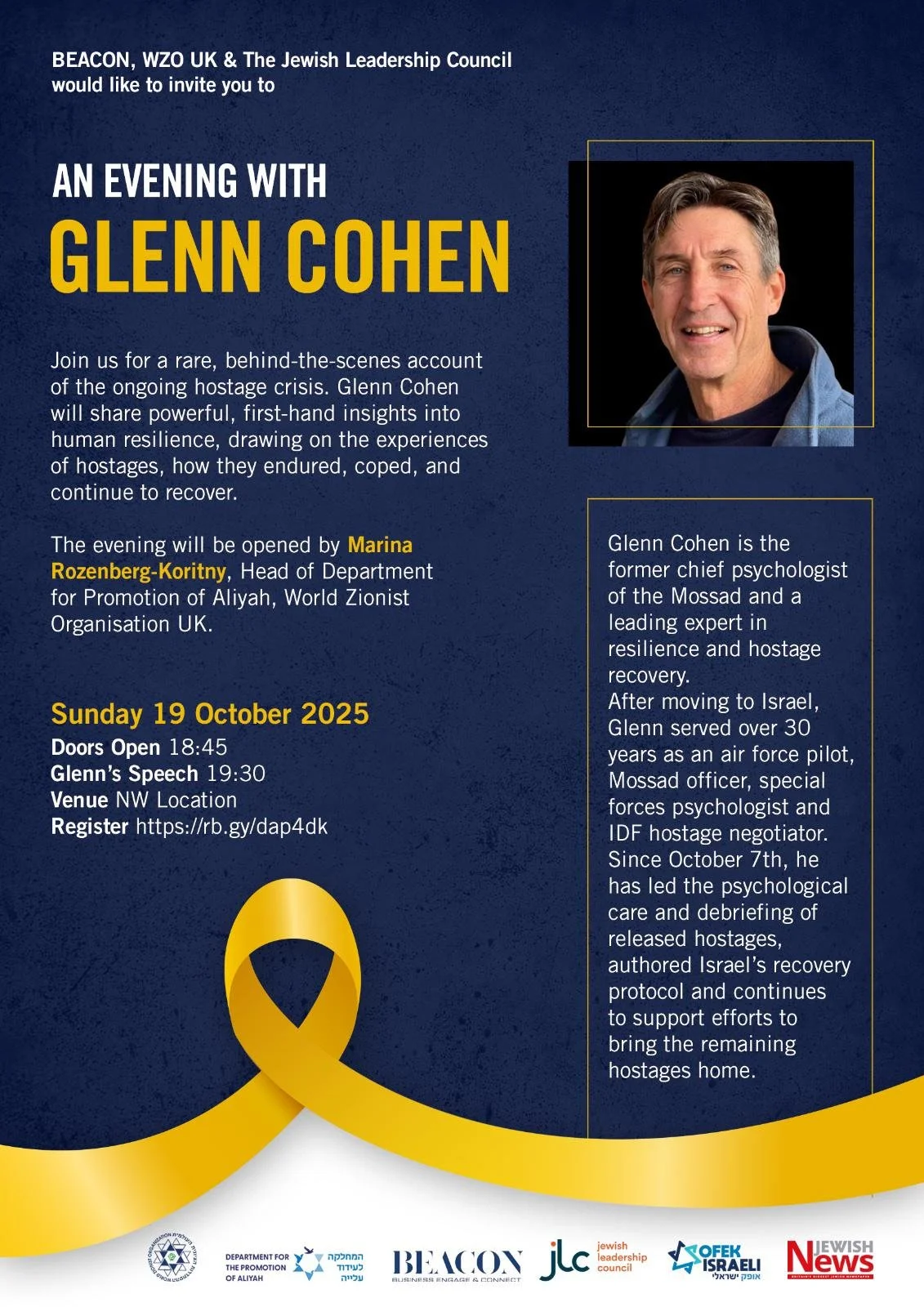 Join the Jewish Leadership Council, Beacon and WZO UK on Sunday 19th October, for a rare behind-the-scenes account of the ongoing hostage crisis. We will be joined by former chief psychologist of Mossad Glenn Cohen, who will share a powerful, first-hand insights into human resilience, drawing on the experiences of hostages and how they endured, coped and continue to recover. Food and drink will be served.