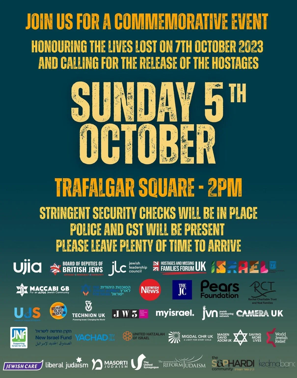 October 7th Commemorative Event Sunday 5 October 2025 14:00 15:00 Google Calendar ICS SUNDAY, 2PM, TRAFALGAR SQUARE: Stand in solidarity with the Jewish community. The commemoration for 7th October is ON. Enhanced CST and Police presence. Please arrive early to enter on time.Date: Sunday 5th October 2025Location: Trafalgar SquareTime: 2pm start