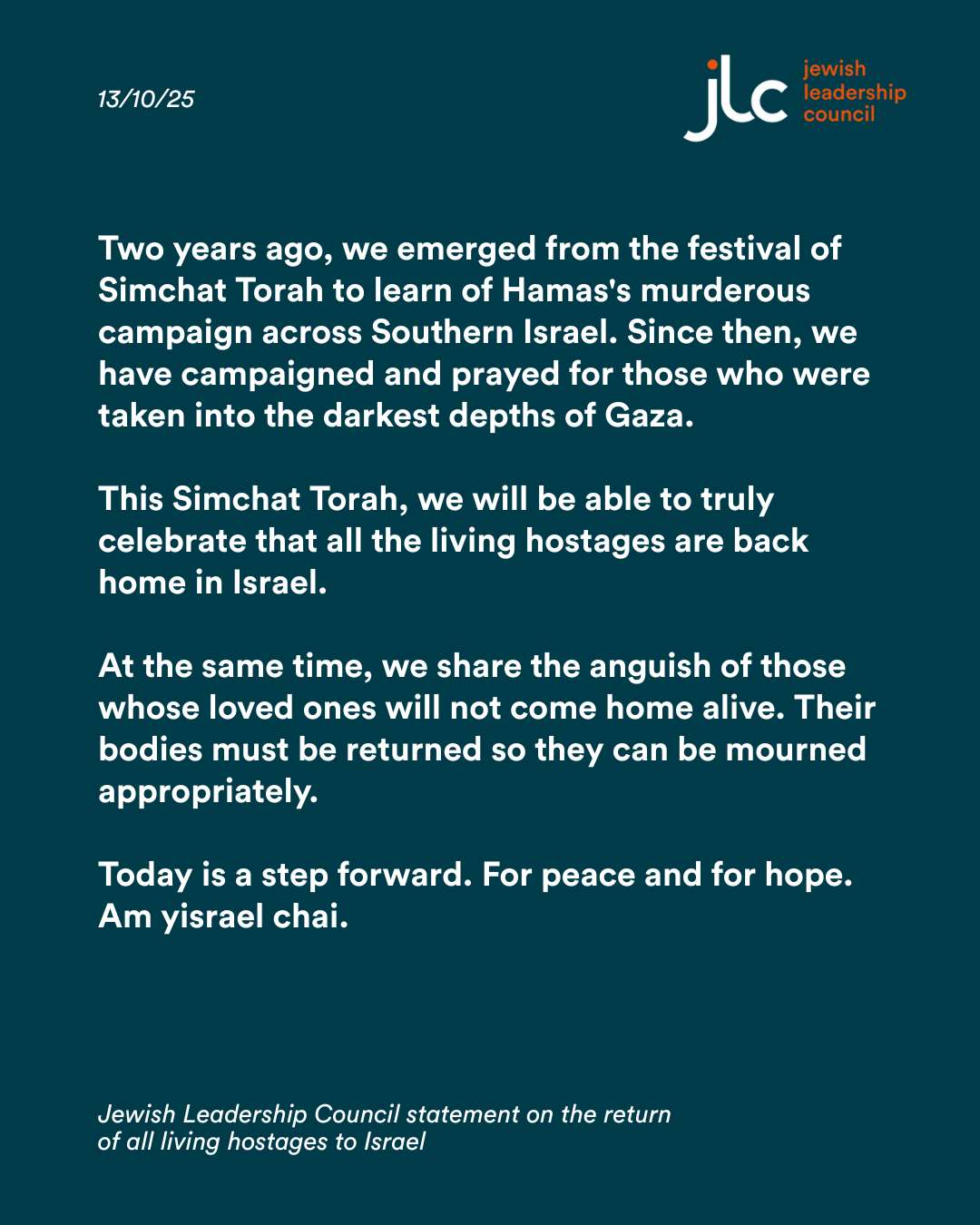 Jewish Leadership Council’s statement on the news that all living hostages have been returned to Israel. 13 Oct Written By Tyla Dallas Tyla Dallas